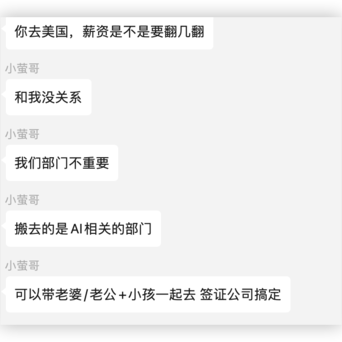 微软将中国AI团队全部打包去美国,发生啥事了?从疑似微软员工的聊天记录中可以看出,涉及此次工作变动的员工,可带老婆孩子,公司会帮忙搞定签证。