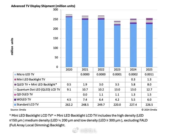 Omdia 发布《Mini LED背光市场跟踪报告》,报告中指出,到2025年,Mini LED背光电视预计出货量将达到930万台,首次超过750万台的OLED电视。