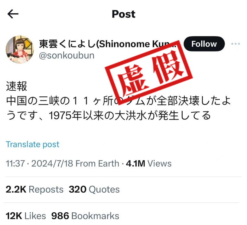 近日,X平台(原推特)上有传言称,中国的三峡大坝疑似尽数垮塌,造成了1975年以来最严重的洪灾。相关说法还附有一则时长约为30秒的视频,据称显示“三峡大坝决堤,造成数千个家庭被迫撤离”的场景。